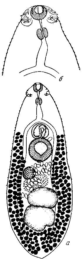 Семенники находятся в середине пространства между задним краем брюшной присоски и задним концом тела.