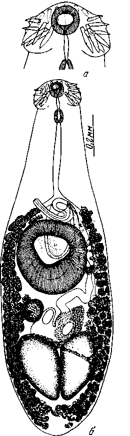 Субтерминальная ротовая присоска 0,099—0,094x0,076—0,086 мм. Крупная и хорошо развитая, почти круглая брюшная присоска лежит в начале задней части тела и достигает 0,28 мм в диаметре. Отношение ротовой присоски к брюшной равно 1 : 3. Ротовое отверстие ведет в длинный префаринкс 0,072 мм длины. Фаринкс слабо развит, 0,072x0,045 мм. Пищевод длинный, 0,28 мм длины и 0,04 мм ширины, разделяется впереди полового отверстия на два кишечных ствола, направляющихся к заднему концу тела, где они оканчиваются несколько впереди концов желточников.