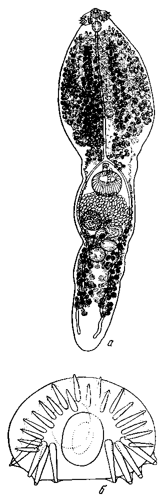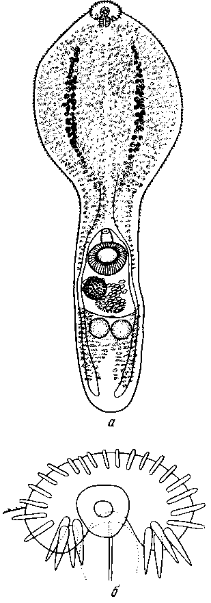 Поверхность тела от уровня околоротового диска до брюшной присоски, за исключением средней части брюшной поверхности, покрыта мелкими шипами с притупленными концами, расположенными в косые поперечные ряды. Размер почкообразного околоротового диска 0,83—1,0 X 0,53 мм; он несет венец шипов. На концах этого венца различимы две группы из четырех более крупных шипов; их размеры 0,21 — 0,24 х 0,032 мм; остальные 19 шипов образуют непрерывный ряд по краю диска и достигают 0,130 — 0,135 X 0,021 — 0,030 мм.