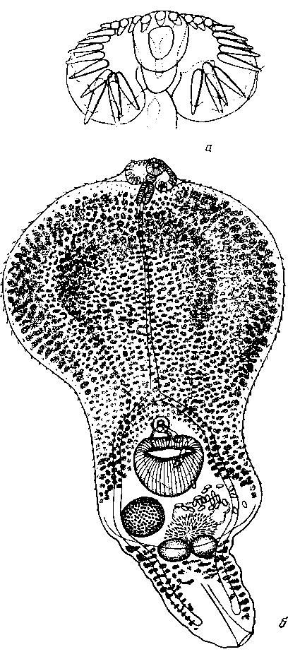 Крупный яичник, 0,432 X 0,449 мм, лежит между правым семенником и брюшной присоской, тесно прилегая к левому кишечному стволу. Овальное тельце Мелиса 0,536 X 0,259 мм, находится в непосредственной близости к семенникам. Желточники обычно заполняют всю переднюю часть тела, огибают брюшную присоску и прерываются на уровне переднего края яичника; затем они появляются вновь и тянутся по бокам тела, оканчиваясь на расстоянии 0,121 мм от заднего конца. За семенниками желточники сливаются друг с другом.