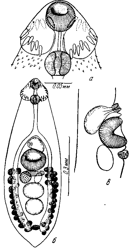 a — адоральный диск; б — марита; в — половая бурса