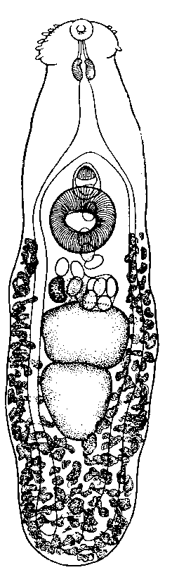Описание вида (по Мендхейму, 1940). Мелкие паразиты, 2,08 мм длины и 0,48 мм ширины. В области шейки образуется сужение. Головной воротник хорошо развит; его размер 0,20 х 0,28 мм. Головные шипы сохранились не полностью. По-видимому, вооружение воротника состоит из 22 или 24 шипов, расположенных в один ряд, прерывающийся дорзально. Шины 0,018 х 0,012—0,016 мм. Слабо развитая ротовая присоска (0,10 X 0,12 мм) переходит в префаринкс длиною 0,06 aim. Размер фаринкса 0,10 X 0,088 мм. Пищевод 0,20 мм длины. Брюшная присоска 0,28 х 0,24мм. Семенники довольно крупные: диаметр переднего 0,22 х 0,32 мм, а заднего— 0,24 X 0,28 мм. Расстояние от задней границы семенников до конца тела вдвое больше, чем расстояние между семенниками и брюшной присоской. Половая бурса, 0,14 х 0,10 мм, заходит за передний край брюшной присоски. Она содержит крупный семенной пузырек, неясно разделенный па две части. Простатическая часть хорошо развита.