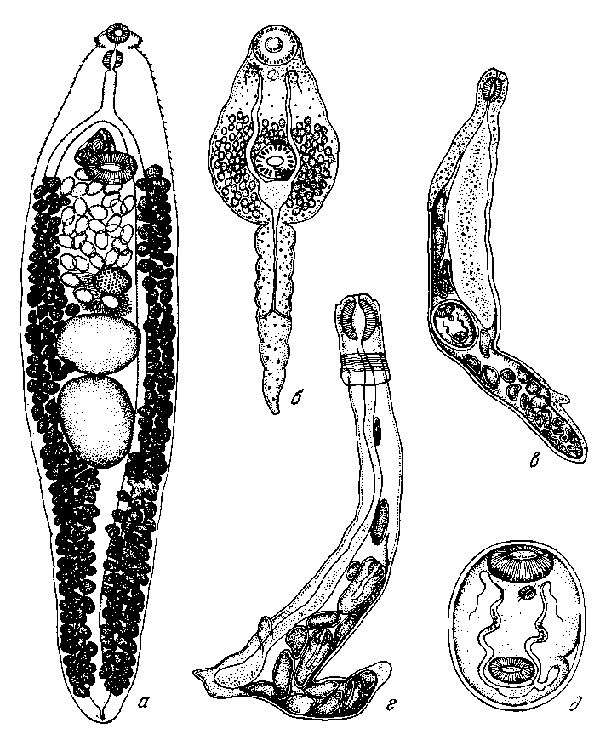 a — марита; б — церкарий; в — редия; г — редия; д — метацеркарий