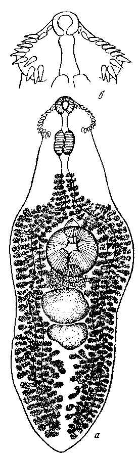 Между центром брюшной присоски и местом бифуркации кишечника находится грушевидная половая бурса.