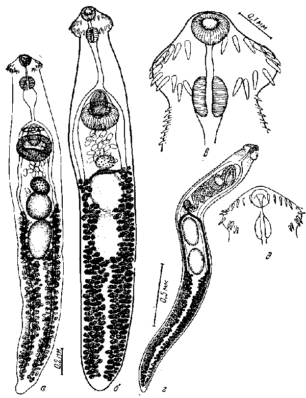a — марита (по Башкировой, 1941); б и в — марита и адоральный диск (по Ошмарину, впервые); г и д — то же (по Лооссу, 1899)