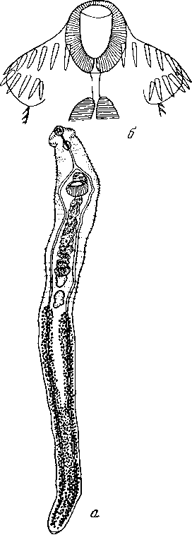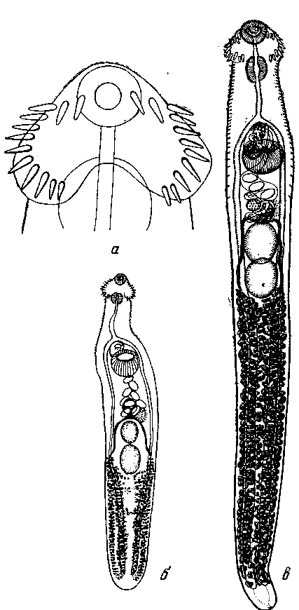 а, б — адоральный диск и марита (по Лооссу, 1899); в — марита (по Ямагути, 1939)