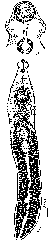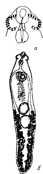 Желточные протоки соединяются впереди яичника, образуя желточный резервуар. Петли матки располагаются между яичником и развилком кишечника, не переходя кнаружи от кишечных стволов.