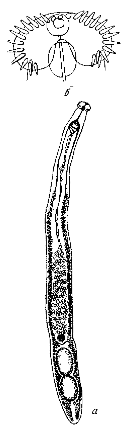 Описание вида (по Ямагути, 1939). Тело тонкое, 6,1—8,5 мм длины, с максимальной шириной 0,5—0,65 мм. Передняя часть тела короткая, суженная позади головного воротника, с резко выраженной продолговатой выемкой на вентральной стороне; задняя часть тела постепенно расширяется от области яичника до переднего семенника, затем снова суживается. Кутикула тела покрыта чешуевидными шипами, за исключением головного воротника и заднего конца. Подкутикулярная продолговатая мускулатура сильно развита.