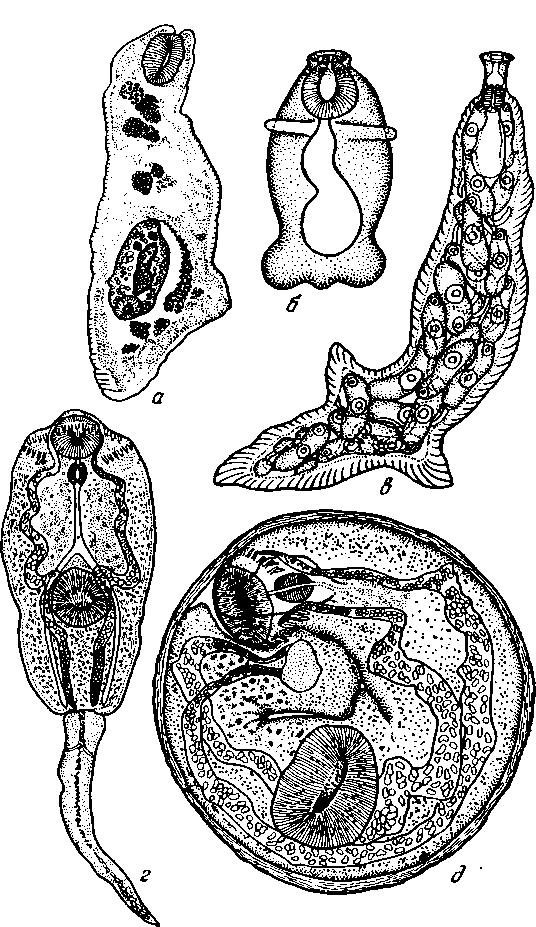 a — материнская редия с дочерними редиями; б — дочерняя редия; в — зрелая дочерняя редия; г — церкарий; д — метацеркарий