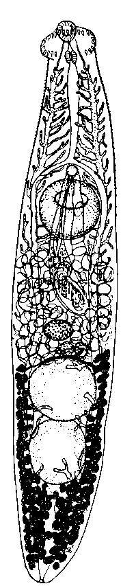 Брюшная присоска расположена в первой трети тела, достигает 0,22—0,28 мм в диаметре. Соотношение размеров присосок, как 1 : 3,8. Овальные или округлые семенники лежат друг за другом во второй половине тела; диаметр переднего 0,2—0,3 X 0,2—0,28 мм, а заднего 0,25—0,36х 0,175—0,24 мм. Половая бурса 0,55— 0,7 X 0,11—0,13 мм доходит до яичника. Простатическая часть 0,38 мм ширины. Округлый яичник 0,1—0,13 мм в диаметре, располагается немного впереди середины тела. Семяприемник мало заметный. Петли матки занимают всю область между семенниками и брюшной присоской. Яйца овальные, с тонкой оболочкой, 0,100—0,120 X 0,075—0,108 мм. Желточники тянутся от уровня семенников до конца тела, расширяясь за семенниками.