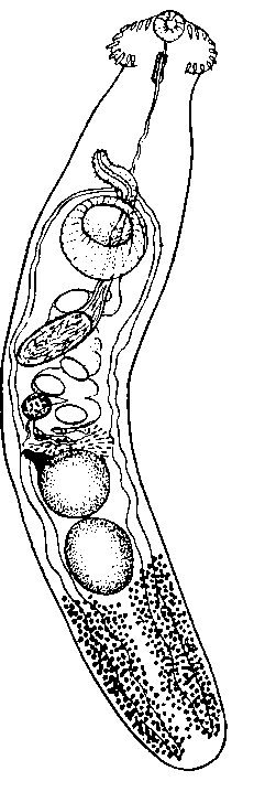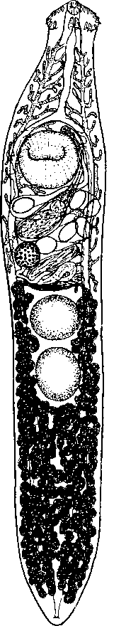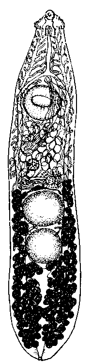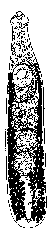 Брюшная присоска 0,28—0,36 мм в диаметре, расположена в конце первой трети тела. Округлые или поперечно-овальные семенники лежат тесно друг за другом на границе двух последних третей тела и достигают 0,25— 0,37 X 0,47 мм. Половая бурса 0,6 — 0,85 X 0,12 — 0,20 мм, почти доходит до уровня яичника. Семенной пузырек крупный, извитой. Половое отверстие находится па полпути между развилком кишечника и брюшной присоской. Яичник овальный; его размер 0,105—0,138 мм. Петли матки перекрывают кишечник. Яйца овальные, 0,099—0,105 X 0,069—0,072 мм. Желточники начинаются от уровня заднего края брюшной присоски или позади нее и тянутся до конца тела, расширяясь за семенниками.