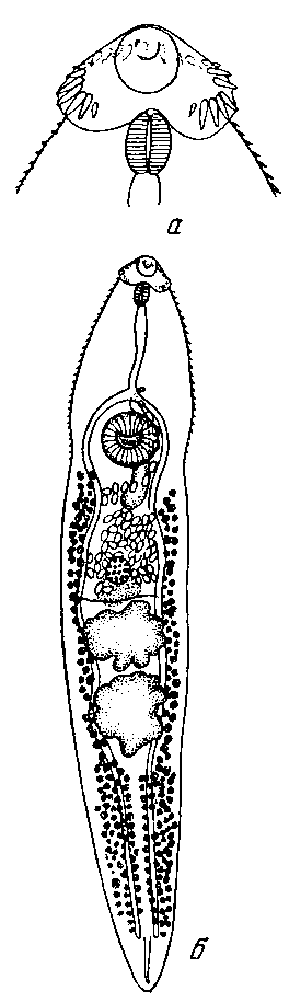 Описание тела (по Ямагути, 1939). Тело паразитов продолговатое, 2,2—3,1 мм длины и 0,5—0,85 мм максимальной ширины вблизи округленного заднего конца. Кутикулярные шипы вследствие постмортальных изменений выпали. Головной воротник около 0,25 мм в диаметре, вооружен 23 шипами, расположенными в непрерванном ряду; их размеры 0,033—0,042 X 0,009—0,010 мм. Ротовая присоска, 0,09—0,1 мм в диаметре, переходит в префаринкс 0,020—0,050 мм длины. Фаринкс эллиптический, 0,075—0,087 X 0,048—0,075 мм. Пищевод 0,25—0,45 мм длины.