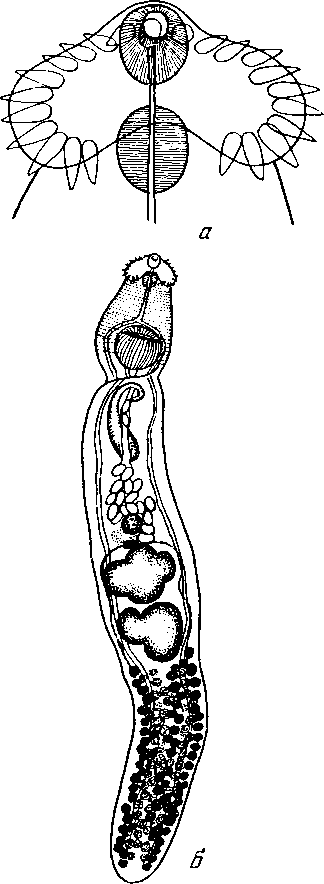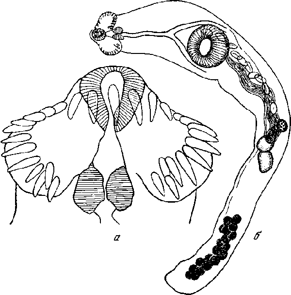 Семенники лежат на конце тела плотно друг за другом; они имеют округлую или продолговато-овальную форму; их размеры 0,23—0,25 X 0,21—0,23 мм. Перед семенниками находится тельце Мелиса, а впереди него яичник 0,17—0,20 X 0,13—0,15 мм в диаметре. Половую бурсу обнаружить не удалось. Семенной же пузырек 0,28—0,42 X 0,077—0,14 мм, лежит далеко позади брюшной присоски. Матка в начале располагается многочисленными поперечными петлями. Яйца с крупной крышечкой, 0,060— 0,085 X 0,036 — 0,060 мм. Мирацидии имеют на конце коричневое глазное пятно.