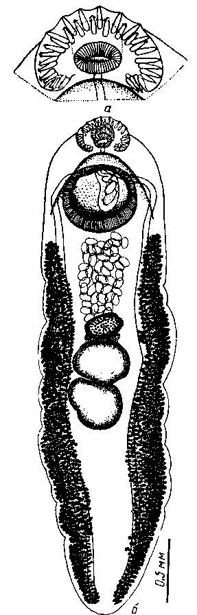 Далее мы присоединили к роду Microparyphium вид из другого рода — Echinochasmus ruficollis Ishii, 1935. Этот вид по своим родовым и видовым признакам стоит гораздо ближе к роду Microparyphium, чем к Echinochasmus. Для рода Echinochasmus основными диагностическими признаками являются сильно развитый головной воротник, крупные поперечно вытянутые семенники и короткая матка с немногими яйцами. Echinochasmus ruficollis Ishii ни одним из этих признаков не обладает; наоборот, он имеет слабо развитый головной воротник, который, судя по его размеру и внешнему виду (изображенному на рисунке), представляет собой два слабых валика по бокам крупной ротовой присоски, длинную матку с многочисленными яйцами; размеры и соотношение размеров присосок, расположение головных шипов также совпадают с теми же признаками рода Microparyphium. Число же головных шипов, сближающее эту форму с представителями рода Echinochasmus, не может быть принято за родовой признак, тем более что таковое у большинства видов рода Microparyphium не выяснено.