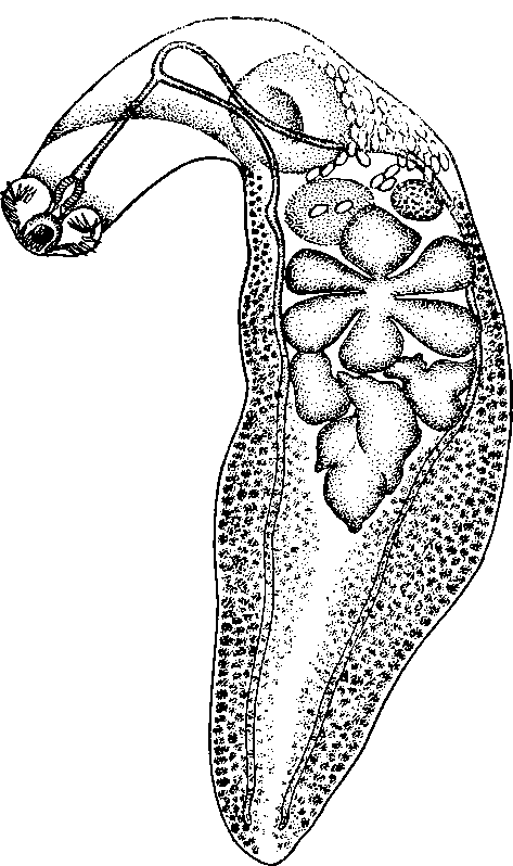 Позади брюшной присоски в одной стороне тела лежит круглый яичник, а в другой оотип (тельце Мелиса?), который несколько крупнее яичника и может содержать почти зрелое яйцо. Очень крупные поперечноовальные семенники лежат один позади другого близ заднего конца тела, причем они настолько прижаты один к другому, что могут деформироваться от давления. Матка содержит немного относительно крупных яиц с желтой оболочкой. Желточники начинаются латерально на уровне бифуркации и соединяются позади семенников. Половые отверстия и кишечные стволы, поскольку их можно различить, расположены как обычно.