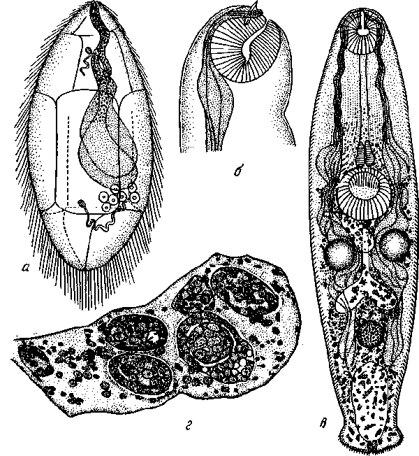a —мирацидии; б — головной конец церкария со стилетом и железами проникновения; в — церкарий; г — спороциста с зародышевыми шарами
