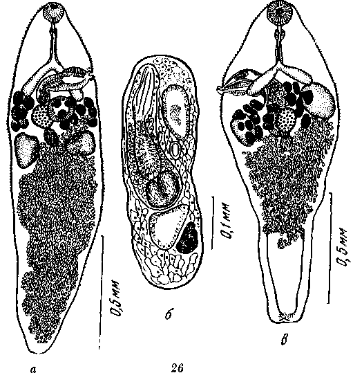 Яичник почти шаровидный, 0,10 — 0,16 X 0,10—0,15 мм, лежит между правым семенником и правым кишечным стволом, слегка налегая на последний.