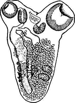 Желточники очень слабо развиты, у большинства экземпляров едва видимы; они расположены на уровне яичника и семенников, причем несколько (около 12) слабо выраженных фолликулов, которые имеют тенденцию превращаться почти в трубковидные образования, можно видеть непосредственно позади яичника; желточные фолликулы с левой стороны тела обычно совсем не наблюдаются. У одного экземпляра, у которого семенники, по-видимому, отсутствовали, с левой стороны имелись следы фолликулов. Внешний вид экземпляров позволяет предположить, что развитие матки и семенников вытесняет желточники с этой стороны. Экскреторный пузырь простирается вперед до яичника.