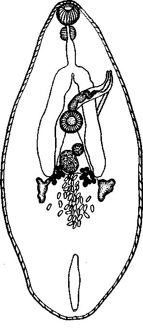 Яичник очень маленький, круглый, с гладкими краями, лежит на небольшом расстоянии позади брюшной присоски, между медианной линией и левым кишечным стволом.