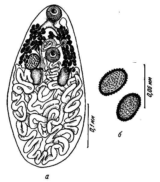 Почти шаровидный яичник, 0,13—0,15 X 0,12—0,15 мм, лежит на уровне брюшной присоски, непосредственно впереди правого семенника. Семяприемник овальный, относительно крупный, лежит впереди и дорзально от брюшной присоски. Матка заполняет заднюю половину тела. Яйца овальные, с толстой оболочкой, светлокоричневого цвета, достигают 0,027x0,018 мм, без шипиков. Желточники состоят из многочисленных мелких, плотно прилегающих друг к другу пигментированных фолликулов, расположенных вдоль латеральных краев передней половины кишечных стволов. Желточный резервуар расположен дорзально от брюшной присоски. Экскреторный пузырь Y-образный, с терминальным отверстием; он раздваивается позади брюшной присоски, причем его ветви почти достигают ротовой присоски.
