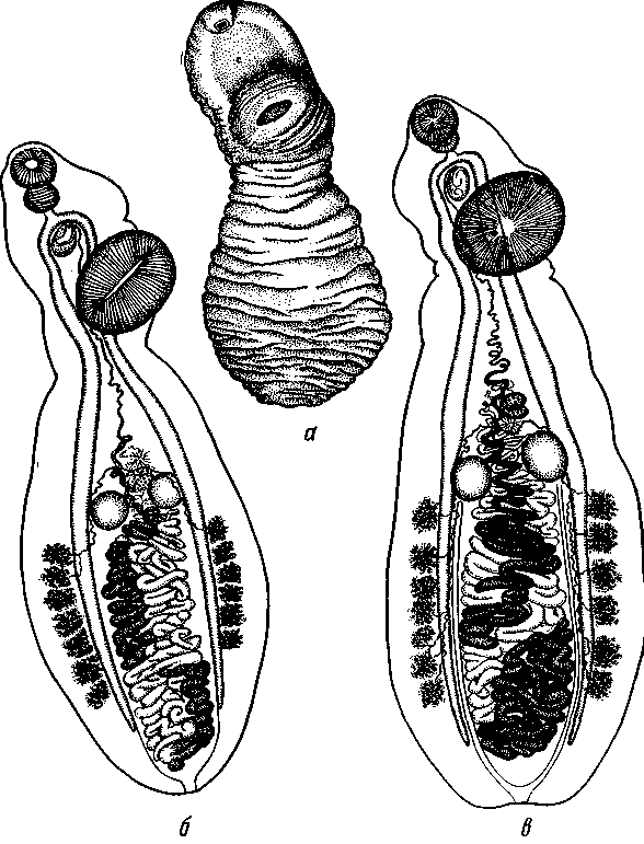 а — внешний вид зрелого экземпляра о вентральной стороны; 6 — марита вентрально; в— марита дорзально