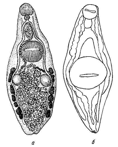 а - марита дорзально; б — незрелый экземпляр вентрально, с экскреторной системой