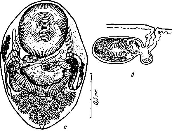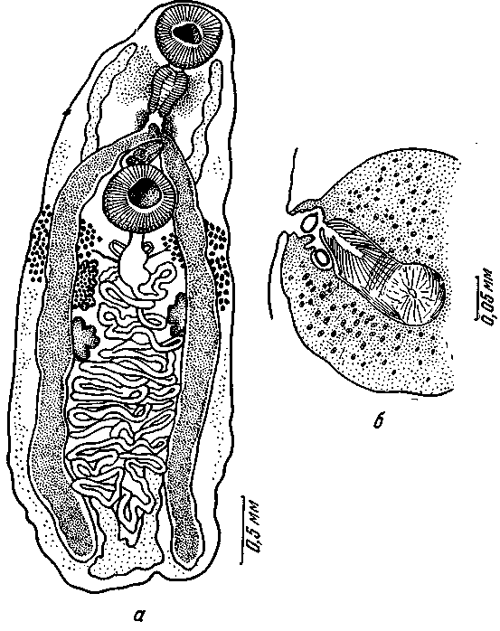 Фаринкс крупный, грушевидный, расширен у переднего конца. Пищевод обычно почти в два раза короче фаринкса. Кишечные стволы крупные, заполнены темным содержимым (кровью хозяина), идут назад от пищевода и простираются почти до заднего конца тела. В передней части тела заметны железистые клетки, одна группа которых расположена латерально и дорзально по отношению к фаринксу, другая группа окружает пищевод. Половое отверстие лежит несколько влево от медианной линии тела, немного впереди брюшной присоски, приблизительно на уровне кишечной бифуркации. Половая бурса булавовидная; ее длина почти в два раза больше ширины; она тянется от полового отверстия медианно назад через медианную линию и заканчивается у переднего края брюшной присоски, занимая область впереди брюшной присоски, между кишечными стволами.