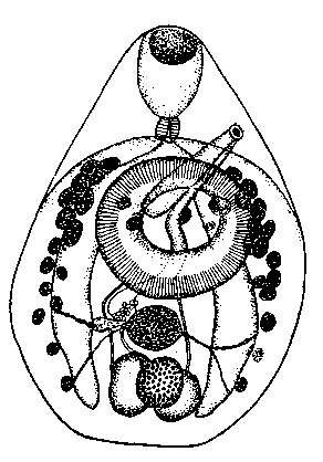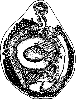 Петли матки простираются между брюшной присоской и передним семенником. Размеры яиц 0,075—0,09x0,048—0,057 мм - Pycnadenoides pagrosomi Yamaguti, 1938.