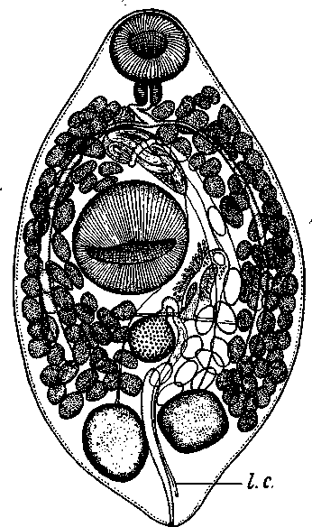 Яйцевод выходит из переднего конца яичника. Лауреров канал длинный; на проксимальном конце он образует семяприемник, суживается в дистальной части и открывается наружу на середине дорзальной поверхности, близ заднего конца тела. Матка, выйдя из тельца Мелиса, идет назад до переднего края правого или левого семенника, где заворачивает и тянется к половому отверстию. Яйца немногочисленные, овальные, более или менее плоские на одном конце; они достигают 0,072—0,075 X 0,045—0,048 мм. Желточники окружают кишечные стволы, начинаясь на уровне фаринкса или пищевода и заканчиваясь на уровне семенников, иногда проникая в пространство между семенниками и позади них. Экскреторный пузырь медианный, трубчатый, проходит между семенниками почти до яичника; его отверстие находится на коническом выступе заднего конца тела.