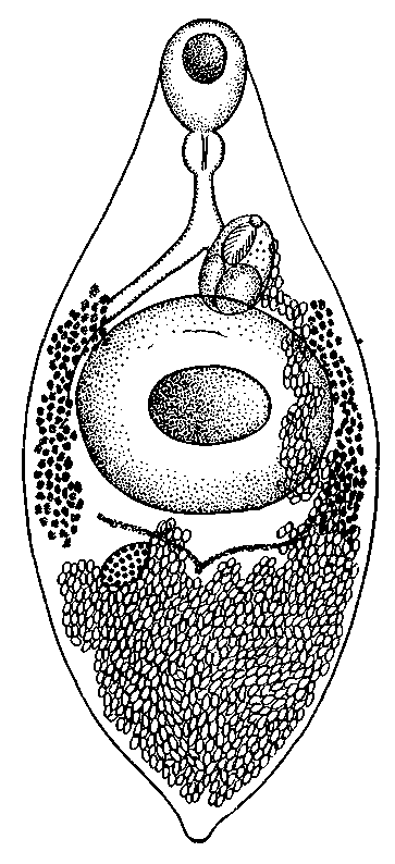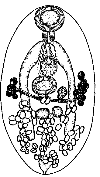 Яичник и семенники также почти полностью заслонены маткой. Половая бурса длинная, луковицеобразная, лежит непосредственно впереди брюшной присоски, касаясь ее своим задним концом. Половое отверстие расположено на уровне бифуркации кишечника, приблизительно на половине расстояния между нею и левым краем тела. Семенной пузырек относительно крупный. Желточные железы расположены по бокам брюшной присоски, простираются на короткое расстояние как кпереди, так и кзади от нее. Петли матки плотно прилегают друг к другу и заполняют почти всю постацетабулярную область. Яйца коричневого цвета, с плотной оболочкой, достигают 0,057—0,063 х 0,033— 0,037 мм. Размеры яиц превышают данные, указанные для этого вида Однером,