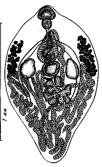 Семяприемника нет, но существует маточный семяприемник. Петли матки простираются от середины брюшной присоски до заднего конца тела, частично налегая на желточники, яичник и семенники. Терминальная часть матки проходит между брюшной присоской и левым семенником, образуя метратерм со слабо развитыми мышцами. Размер яиц достигает 0,015 X 0,010 мм. Фолликулярные желточники расположены латерально за пределами кишечных стволов и не налегают на них; они простираются от уровня бифуркации кишечника до середины семенников. Маленький, мало заметный желточный резервуар лежит сейчас же позади брюшной присоски.