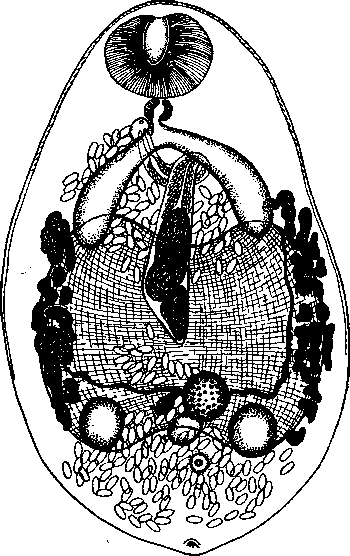 Короткие и широкие кишечные ветви немного заходят в область средней трети длины тела. Имеется огромный мышечный фиксаторный орган (названный нами «диск Ямагути») приблизительно квадратной формы; центр его находится немного позади уровня середины длины тела; передний и задний края его вогнуты; мускулатура этого диска состоит главным образом из дугообразных поперечных мышечных волокон, расположенных в виде и, и из подобных же продольных волокон, сходящихся к вогнутым краям и прикрепляющихся к ним. Кроме того, здесь имеются дорзо-вентральные волокна, соединяющие дорзальную пограничную мембрану с вентральной.