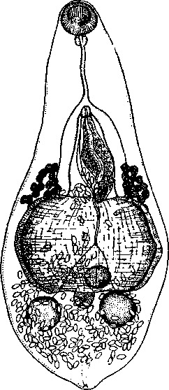 Матка занимает все свободное пространство задней части тела и простирается вперед по бокам брюшной присоски и дорзально от нее до уровня желточников. Метратерм тянется в медианном поле, дорзально относительно брюшной присоски, а дальше вдоль половой бурсы. Яйца удлиненно-грушевидные или почти эллипсоидные, с крышечками на узком конце; их размеры 0,021—0,027 X 0,011—0,015 мм. Желточники образуют с каждой стороны тела компактную массу из 8—10 сравнительно крупных фолликулов, непосредственно позади окончаний кишечных стволов.