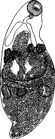 Яичник почти шаровидный или овальный, достигает 0,09—0,11 X 0,12—0,15 мм; он расположен позади брюшной присоски дорзально, обычно справа, непосредственно впереди зоны семенников или проникая в нее большей своей частью. Семяприемник округлый, 0,08—0,15 X 0,075—0,11 мм, находится позади яичника справа или слева. Длинный, узкий извитой лауреров канал выходит из переднего конца семяприемника, очень близко от его соединения с яйцеводом; отверстие лаурерова канала находится дорзально от яичника или семяприемника.