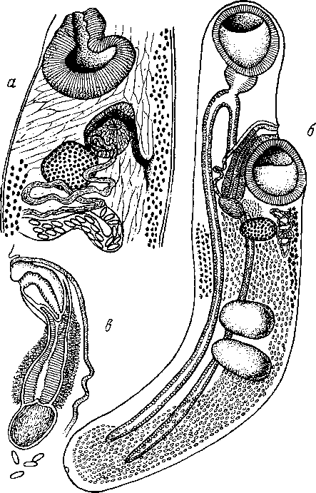 Петли матки лежат между семенниками и брюшной присоской и заполняют пространство от семенников до заднего конца тела.