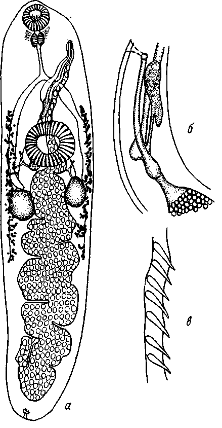 а - марита; б — концевой участок полового аппарата; в — шипы на кутикуле