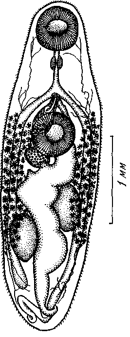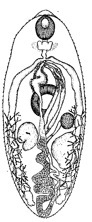 Яичник округлый, но иногда может быть овальным; размер его 0,249— 0,285 X 0,214—0,235 мм; он расположен на правой стороне тела сбоку и позади брюшной присоски. Матка состоит из двух ветвей — восходящей и нисходящей, переплетающихся между собой. На переднем крае брюшной присоски матка переходит в сильно мышечный и железистый извитой метратерм, который заканчивается половым отверстием непосредственно позади кишечной бифуркации. Метратерм и половая бурса удалены друг от друга.