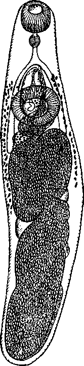 Желточники состоят из ряда фолликулов с каждой стороны и простираются от середины между половым отверстием и передним краем брюшной присоски до уровня переднего семенника.