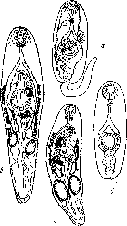 a — церкарий; б — метацеркарий; в — марита дорзально; г — марита вентрально