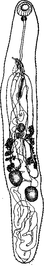 Пищевод длинный, 1,18 мм длины. Половое отверстие лежит немного влево от медианной линии, непосредственно впереди брюшной присоски. Семенники овальные, расположены наискось друг к другу, достигают 0,48 мм длины и 0,39 мм ширины в задней трети длины тела. Половая бурса длинная и узкая, 1,27 мм длины, проходит у правого края брюшной присоски. Яичник круглый, 0,31 мм в диаметре, расположен медианно на середине длины тела. Желточники состоят из крупных фолликулов, занимают пространство от уровня яичника до конца кишечных ветвей. Матка имеет поперечные петли в середине тела и многочисленные большие петли, заполняющие тело позади семенников. Метратерм слабый.