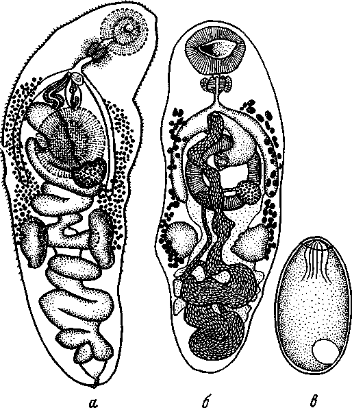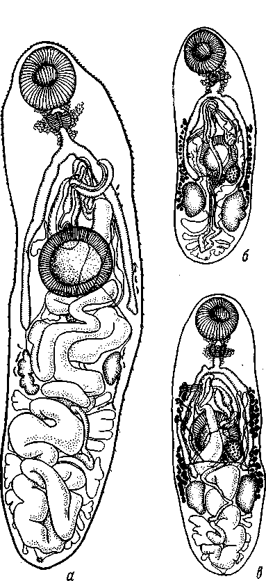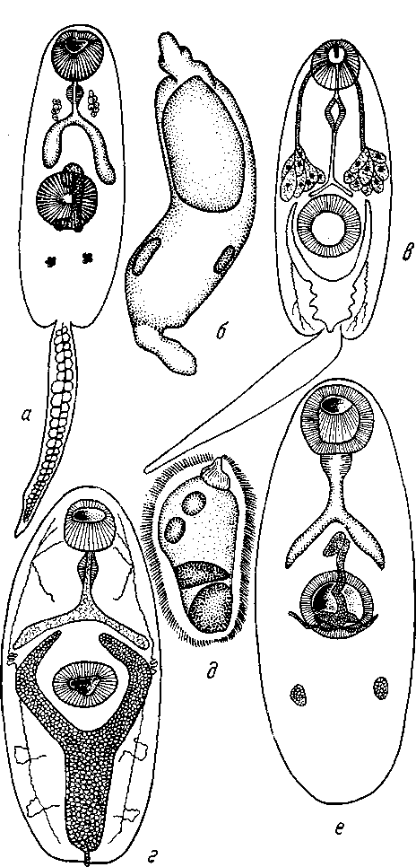 а — церкарий; б — спороциста; в — схема расположения экскреторной системы и желез проникновения у церкария; г — метацеркарий с экскреторной системой; д — мирацидий; е — метацеркарий