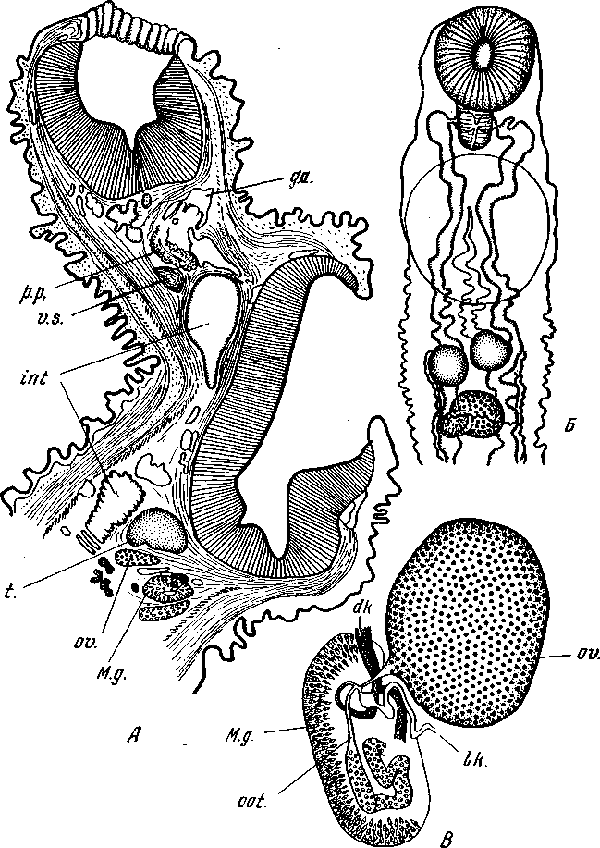A — медианный срез передней части тела; Б — передний конец мариты; В — схема женского полового аппарата (oot.— оотип; g. a.—половой атриум; int.—кишечник; ov.— яичник; p. p.— простатическая часть; M.g— тельце Мелиса; l. h.—лауреров канал; t.— семенник; v. s.— семенной пузырек).