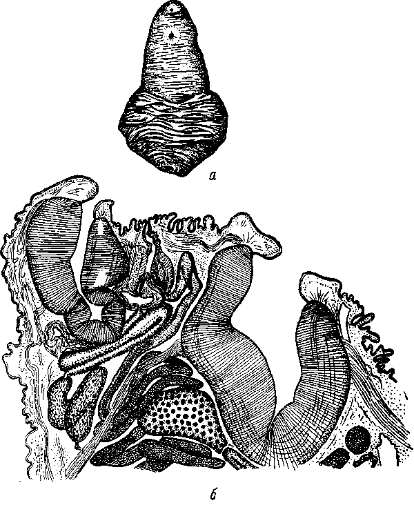 a - внешний вид мариты с вентральной поверхности; б—медианный срез передней части тела