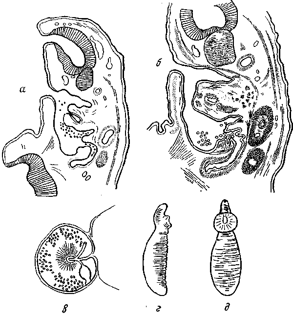 а — продольный срез передней части тела; б — тот же срез в увеличенном виде; в — сагиттальный срез через оотип; г, д — марита, вид с латеральной и вентральной поверхности