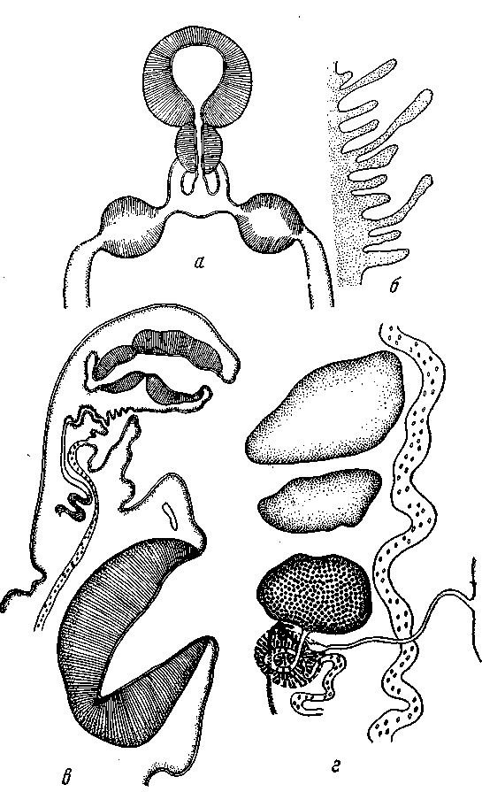 а - схема строения пищеварительной системы; б — ворсинки; в — продольный срез переднего конца тела; г — схема строения половой системы