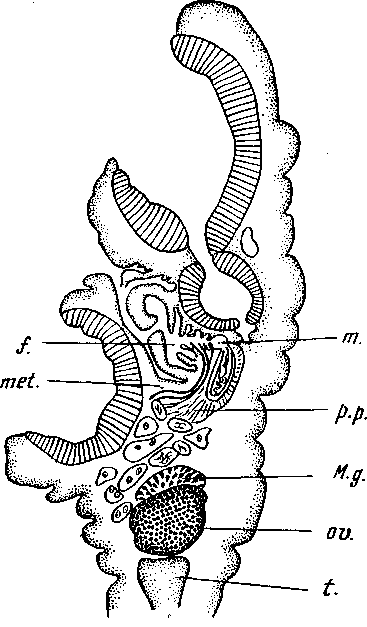 Продольный срез переднего конца тела (f.— половой атриум; m.— мужское половое отверстие; met.— метратерм; р. р простатическая часть; M. g.— тельце Мелиса; ov.— яичник; t семенник)