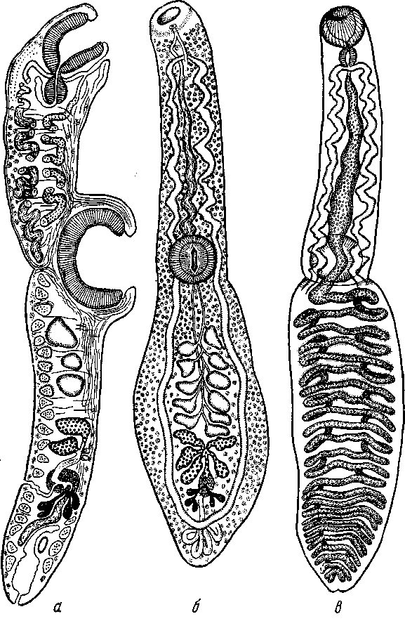 а — продольный срез мариты; б — марита вентрально; в — схема расположения петель матки