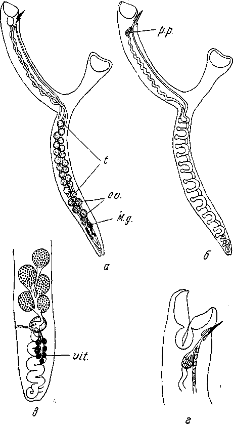 a — марита; б — схема расположения петель матки и выводных половых протоков; в — женская половая система; г — схема строения концевых участков половых протонов (t — семенники; ov.— яичник; M. g.— тельце Мелиса; vit.— желточники; p. p.— простатическая часть)