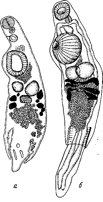 a — продольный разрез тела, видно расположение внутренних органов; б — марита