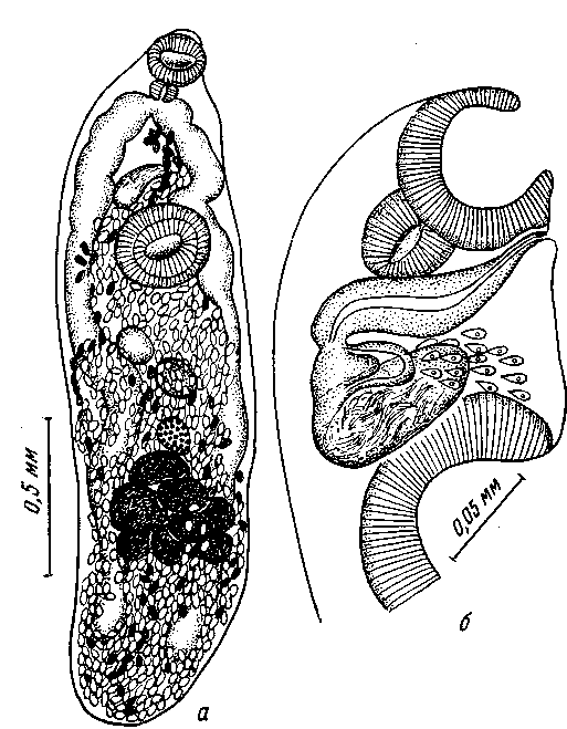 a —марита: 6 — передний конец тела с выводными половыми протоками